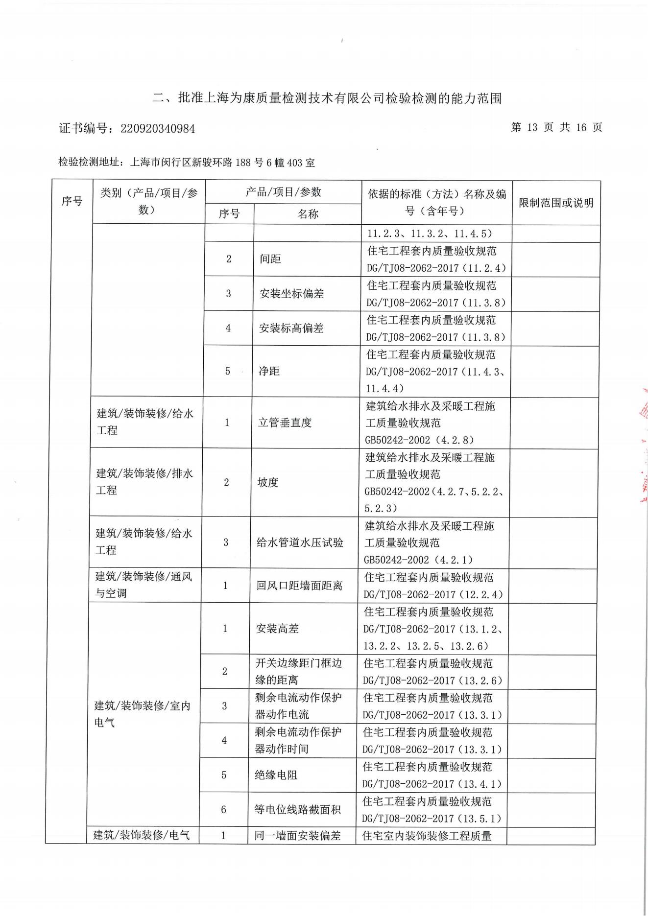 分戶驗(yàn)收要求 分戶驗(yàn)收:即交房前依照相關(guān)標(biāo)準(zhǔn)對(duì)區(qū)域內(nèi)住宅逐套進(jìn)行驗(yàn)收。自2009年10月1日起所有上海市住宅工程強(qiáng)制實(shí)施分戶驗(yàn)收?!渡虾J泄こ藤|(zhì)量分戶驗(yàn)收管理規(guī)定》住宅工程竣工驗(yàn)收前必須依照《住宅工程套內(nèi)質(zhì)量驗(yàn)收規(guī)范》DG/TJ08-2062-2009和現(xiàn)行工程質(zhì)量標(biāo)準(zhǔn)、規(guī)范,對(duì)每戶套內(nèi)的觀感質(zhì)量、使用功能及使用安全進(jìn)行驗(yàn)收。凡未實(shí)施分戶驗(yàn)收的,該工程項(xiàng)目將不得交付使用;服務(wù)范圍 一、裝修房全過(guò)程跟蹤檢查:從毛坯到裝修結(jié)束全過(guò)程跟蹤檢驗(yàn);對(duì)隱蔽工程施工進(jìn)行檢測(cè);對(duì)裝飾 材料進(jìn)行控制;每個(gè)施工節(jié)點(diǎn)作好原始記錄并提出整改意見(jiàn);待整改結(jié)束進(jìn)行復(fù)查,直至符合 要求;最終每戶出具一份檢測(cè)報(bào)告。 二、裝修房竣工驗(yàn)收:主要對(duì)安全、使用功能及表面觀感質(zhì)量進(jìn)行檢測(cè);每個(gè)施工節(jié)點(diǎn)作好原始記錄并提出整改意見(jiàn);待整改結(jié)束進(jìn)行復(fù)查,直至符合要求;最終每戶出具一份檢測(cè)報(bào)告。 三、毛坯竣工驗(yàn)收:主要對(duì)安全、使用功能及表面觀感質(zhì)量進(jìn)行檢測(cè);每個(gè)施工節(jié)點(diǎn)作好原始記錄并提出整改意見(jiàn);待整改結(jié)束進(jìn)行復(fù)查,直至符合要求;最終每戶出具一份檢測(cè)報(bào)告。 四、個(gè)人交房驗(yàn)房檢測(cè)。 建設(shè)工程分戶驗(yàn)收檢測(cè)參考標(biāo)準(zhǔn) DG/TJ08-2062-2017 《住宅工程套內(nèi)質(zhì)量驗(yàn)收規(guī)范 》 DB/T 31/30-2003《住宅裝飾裝修驗(yàn)收標(biāo)準(zhǔn)》 GB50209-2002《建筑地面工程施工質(zhì)量驗(yàn)收規(guī)范》 GB50210-2001《建筑裝飾裝修工程質(zhì)量驗(yàn)收規(guī)范》 GB20242-2002《建筑給排水及采暖工程施工質(zhì)量驗(yàn)收規(guī)范》 GB50300-2001《建筑工程施工質(zhì)量驗(yàn)收統(tǒng)一標(biāo)準(zhǔn)》 GB50303-2002《建筑電氣工程施工質(zhì)量驗(yàn)收規(guī)范》 套內(nèi)質(zhì)量檢測(cè)(一房一驗(yàn))內(nèi)容 檢測(cè)內(nèi)容 建筑尺寸 室內(nèi)地面:水泥砂漿地面、木、竹地板,板塊地面 室內(nèi)頂棚:頂棚抹灰、吊頂工程 室內(nèi)墻面:墻面抹灰、飾面板(磚)墻面、涂飾工程、裱糊工程、軟包工程 建筑門窗 樓梯與護(hù)欄 細(xì)部工程:櫥、柜,窗簾盒、窗臺(tái)板、門窗套、可折裝式隔斷、淋浴房 給排水與燃?xì)猓菏覂?nèi)給水、室內(nèi)排水、衛(wèi)生器具、燃?xì)夤艿? 通風(fēng)與空調(diào):送排風(fēng)和防排煙、空調(diào)工程、 室內(nèi)電氣:燈具安裝、開關(guān)、插座,分戶配電箱、室內(nèi)配線、等電位聯(lián)結(jié) 弱電工程:有線電視安裝工程、電話、信息網(wǎng)絡(luò)安裝工程,訪客對(duì)講安裝工程、安防報(bào)警系統(tǒng) 太陽(yáng)能熱水系統(tǒng) 室內(nèi)環(huán)境評(píng)價(jià)